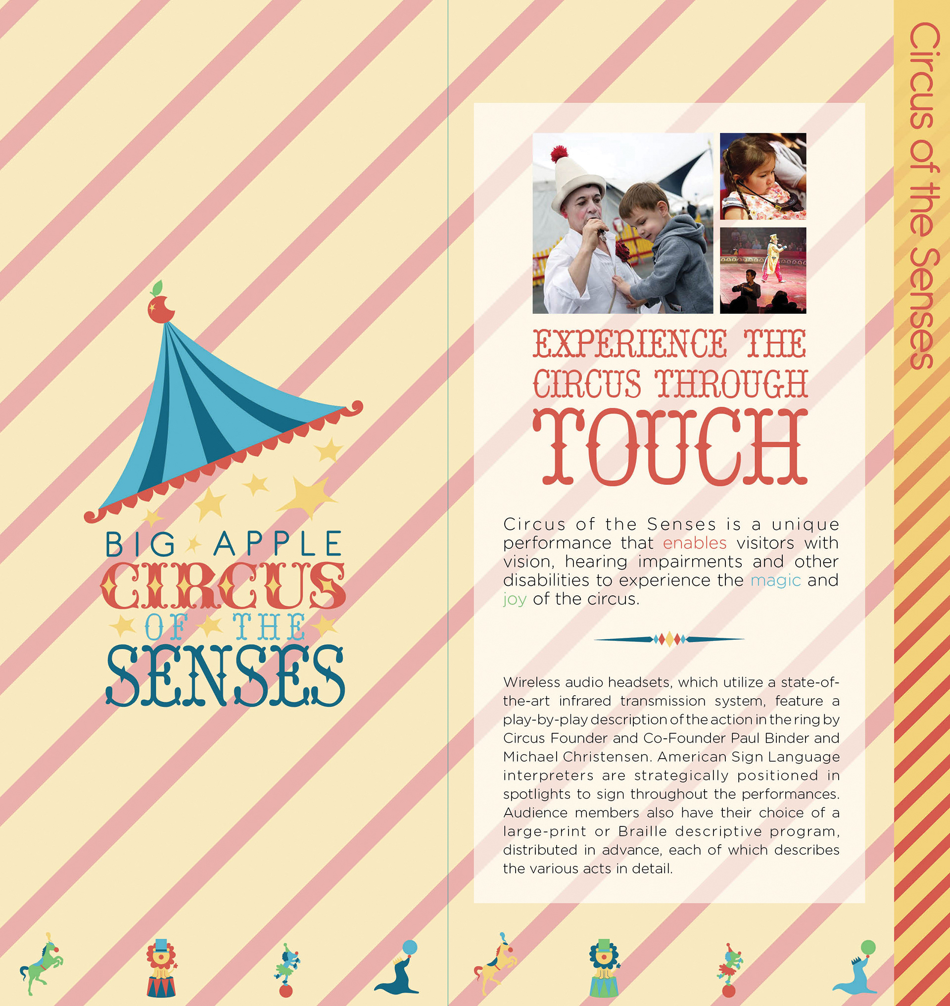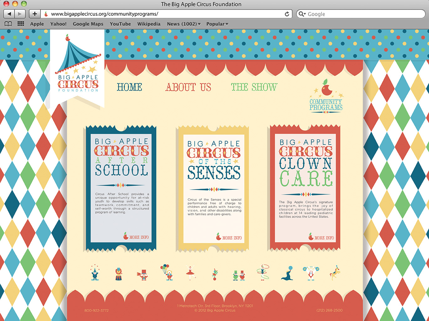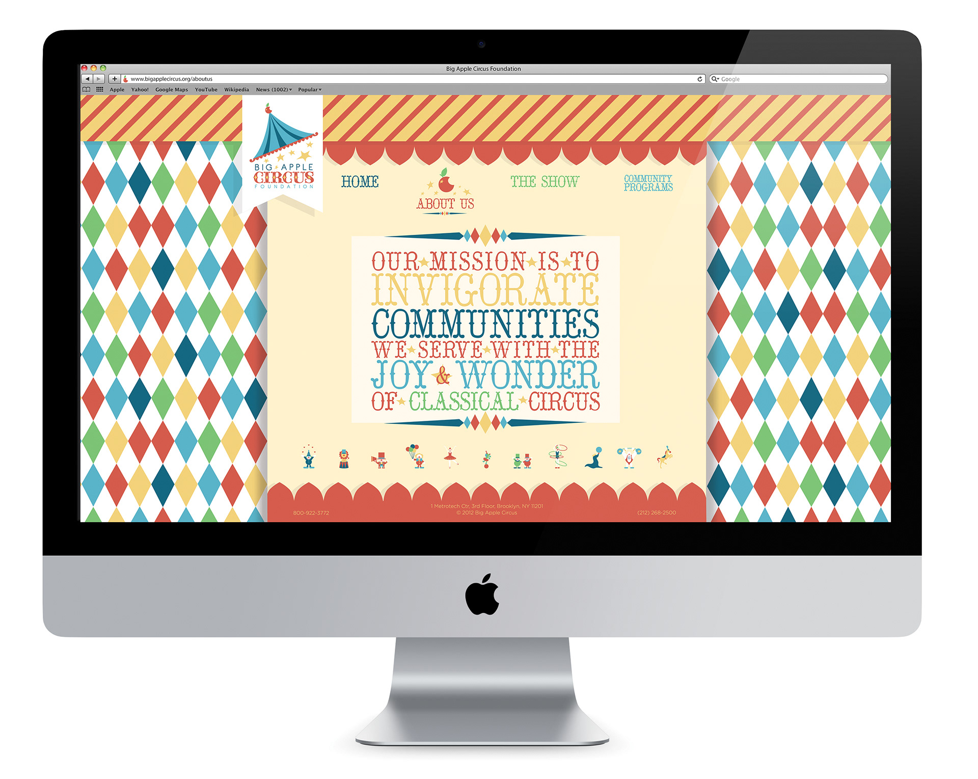Promotional design and branding system for the Big Apple Circus’ logo and brochure showing information about the company in print and web design.